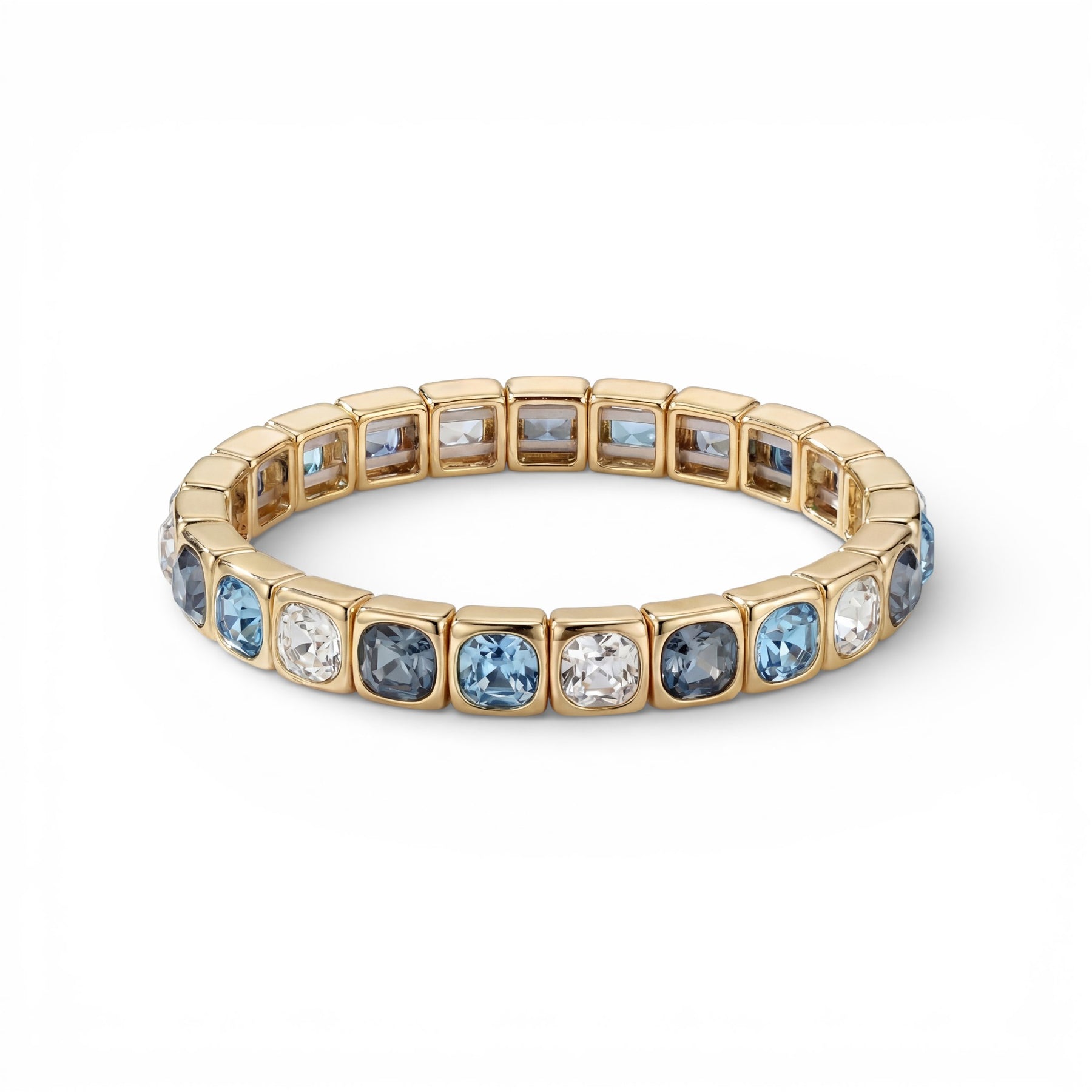 Soft shades of blue and blue-grey are framed in warm gold, creating a bracelet that catches the light with every movement. The palette feels calm yet striking — like sunlight reflecting off the water.