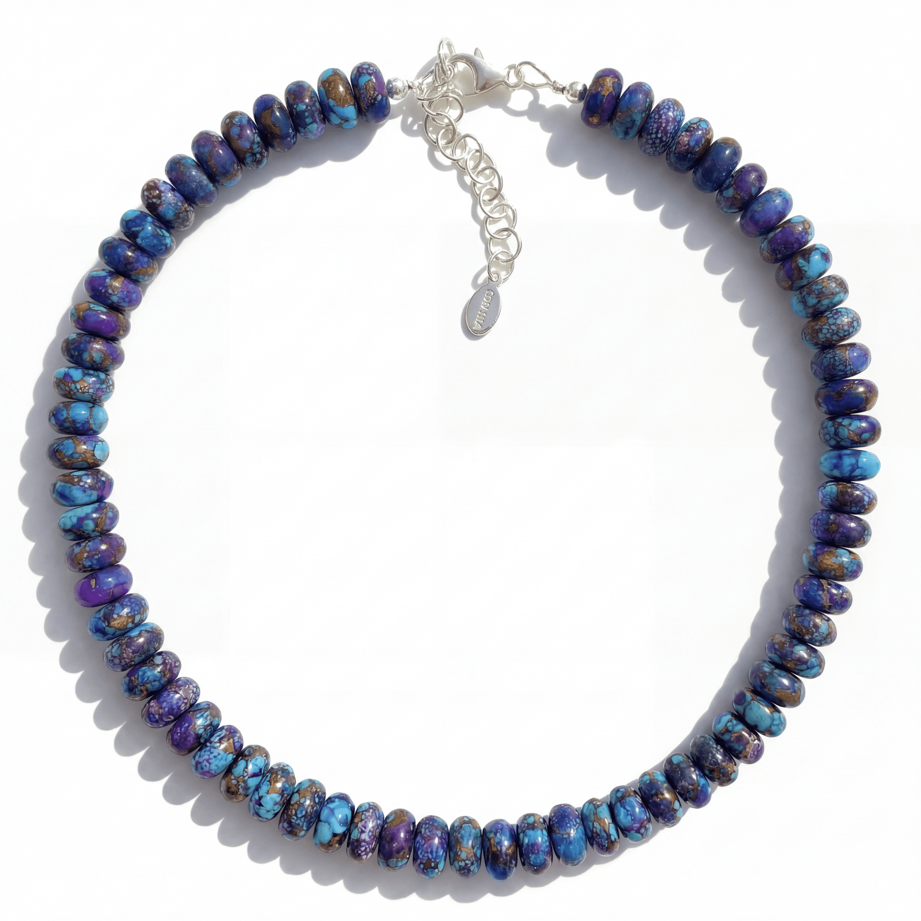 Handcrafted in the U.S. with natural light blue Arizona turquoise that has been stabilized and dyed a deep purple, this necklace expertly marries vibrant blue with warm purple and copper undertones. The striking natural matrix creates a unique color combination that demands attention — no two pieces are exactly alike.